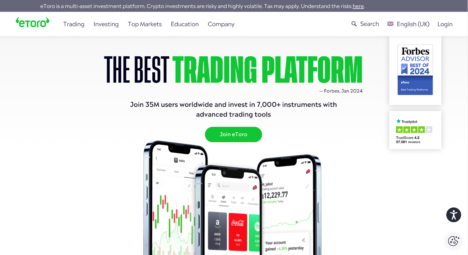 - eToro: Best for beginners entering the forex market, eToro offers CFD-based forex trading and social trading features, including CopyTrader, which allows you to follow and replicate experienced forex traders in real-time.