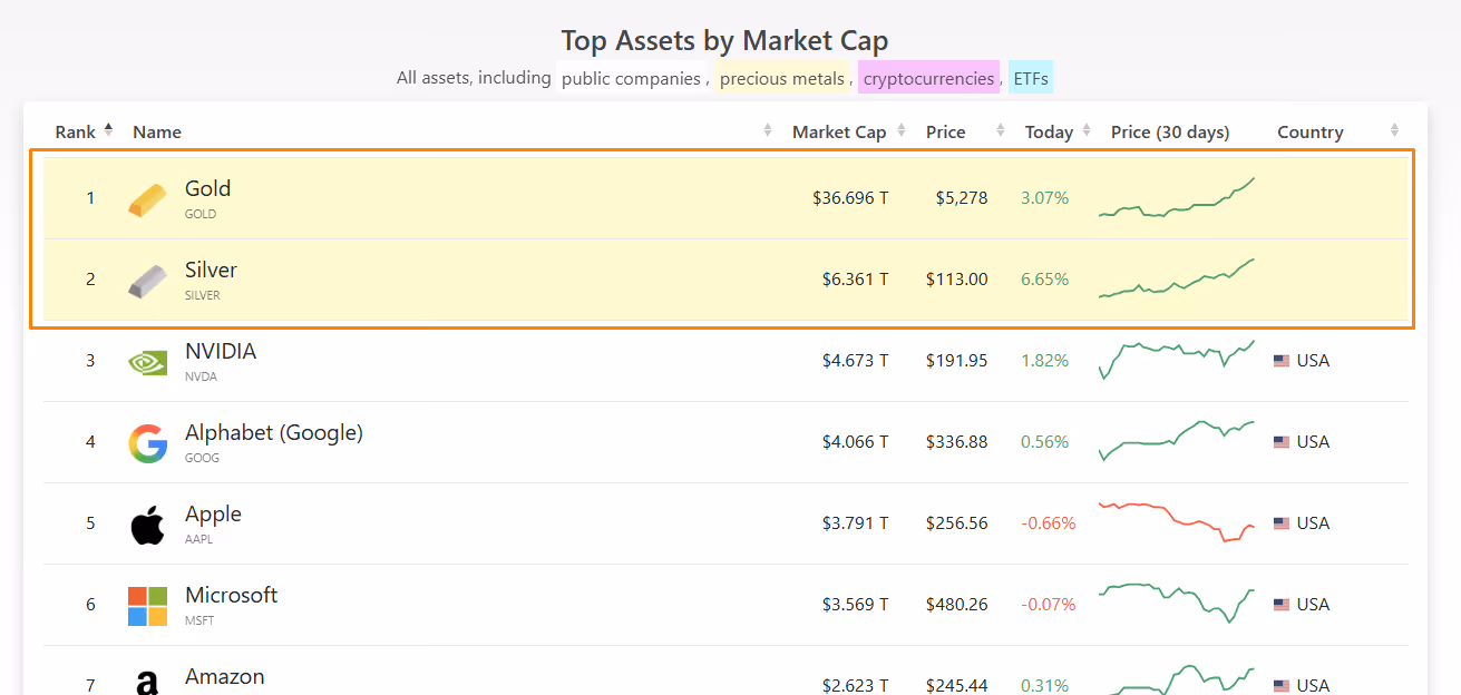 At the start of 2026, the combined market capitalisation of gold and silver had already surpassed that of the so-called "Magnificent Seven" (Apple, Microsoft, Google, Amazon, Nvidia, Meta, and Tesla) by a wide margin, despite these companies dominating the media narrative.