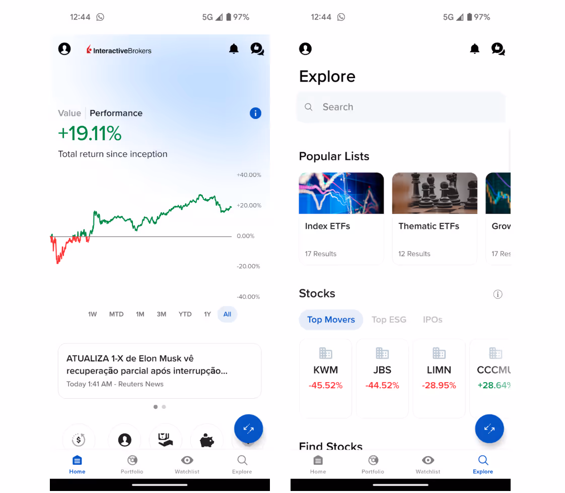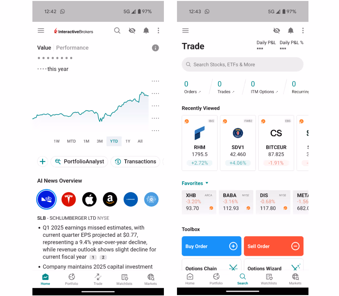 - IBKR Mobile: This is for more experienced investors and is a mobile version of the flagship IBKR desktop platform. It has plenty of functionality for those who need full asset access on the go and want advanced tools and charts at their fingertips.
