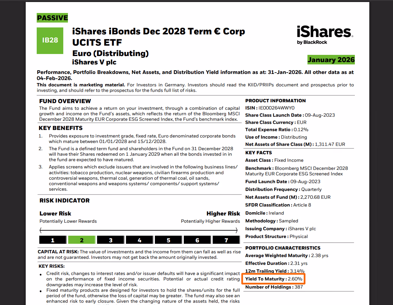 Let’s look at an example: the iShares iBonds Dec 2028 (factsheet) showed a Yield to Maturity (YTM) of 2.60% as of January 2026. This means that if you buy the iBond and hold it until maturity, you can expect an average annual return of around 2.60%, taking into account: