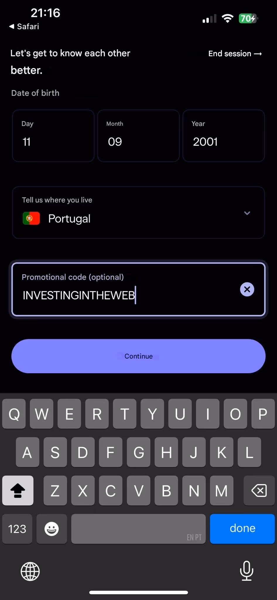 Check that the "referral code" field is filled with INVESTINGINTHEWEB - if not, paste it manually.