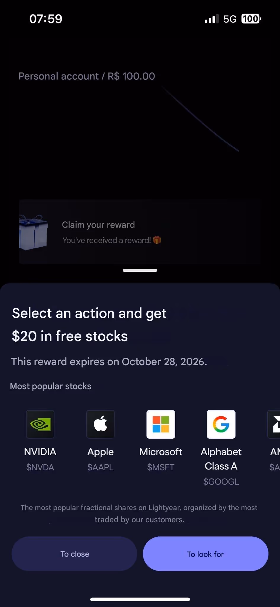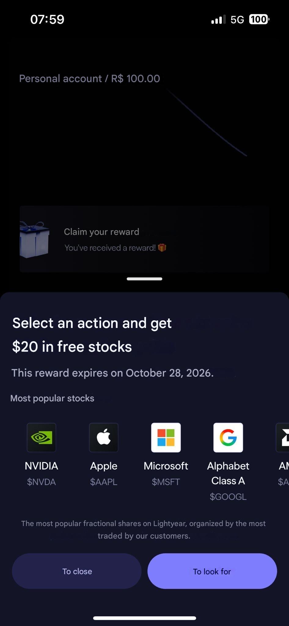 Finally, claim your reward in the "Rewards" section - the fractional share is purchased automatically when the market opens. In our case, we got $20 in free stocks: