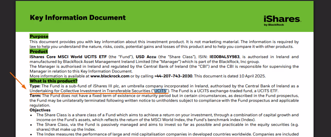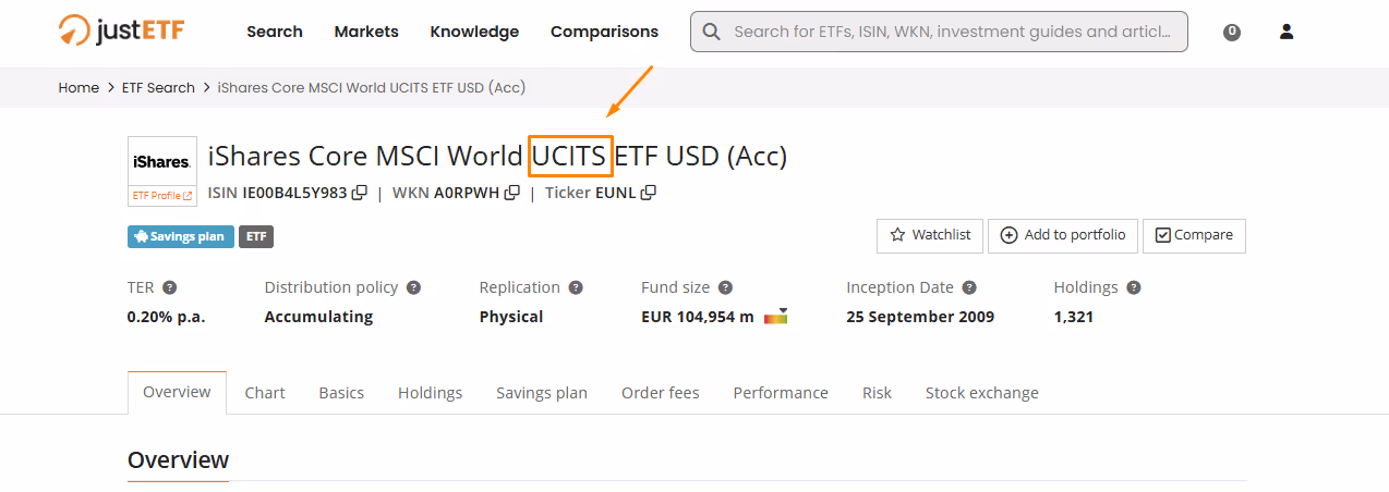 For example, if you search for “IWDA”, the ticker of an ETF tracking the MSCI World Index, you will see that its name includes “UCITS” (iShares Core MSCI World UCITS ETF USD (Acc)):