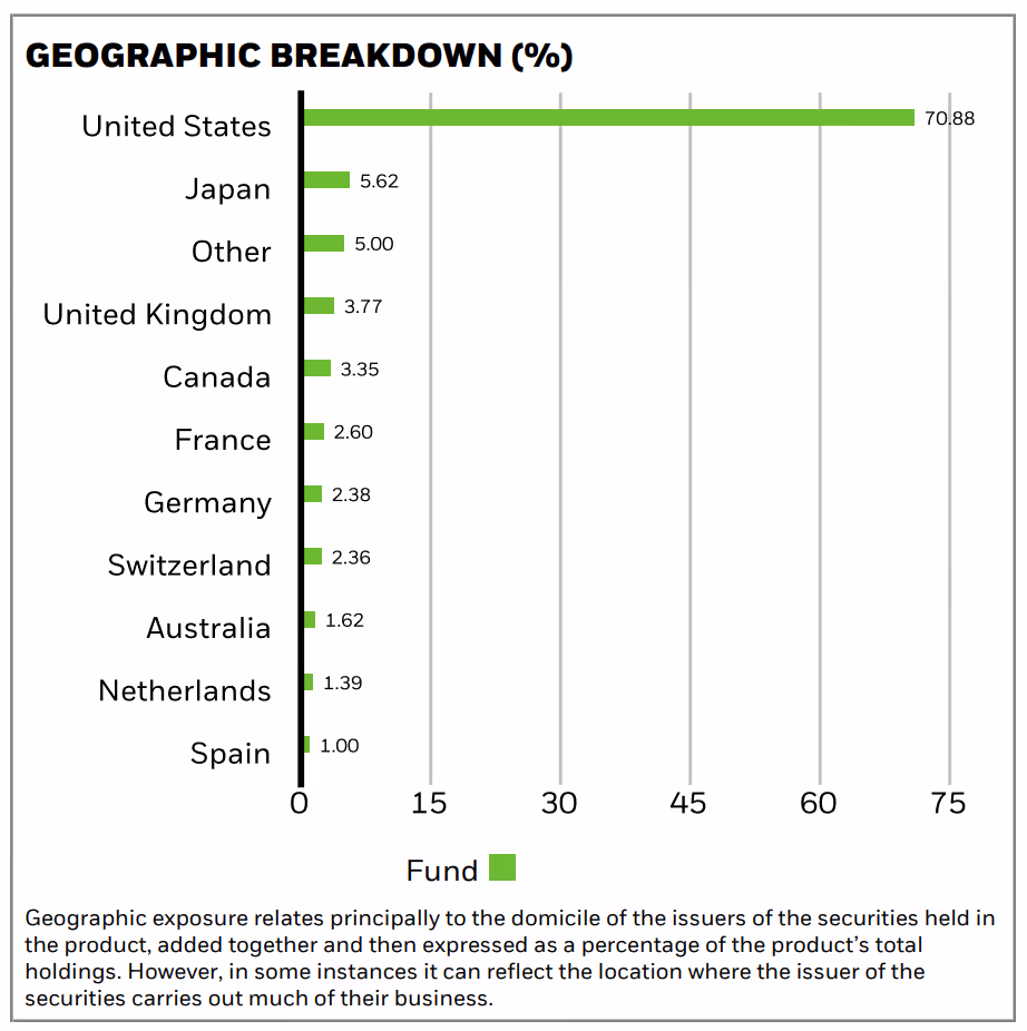 IWDA allocates ~72% of its portfolio to the United States, with Japan as the second-largest country at ~5%. Other important allocations include the UK and Canada.