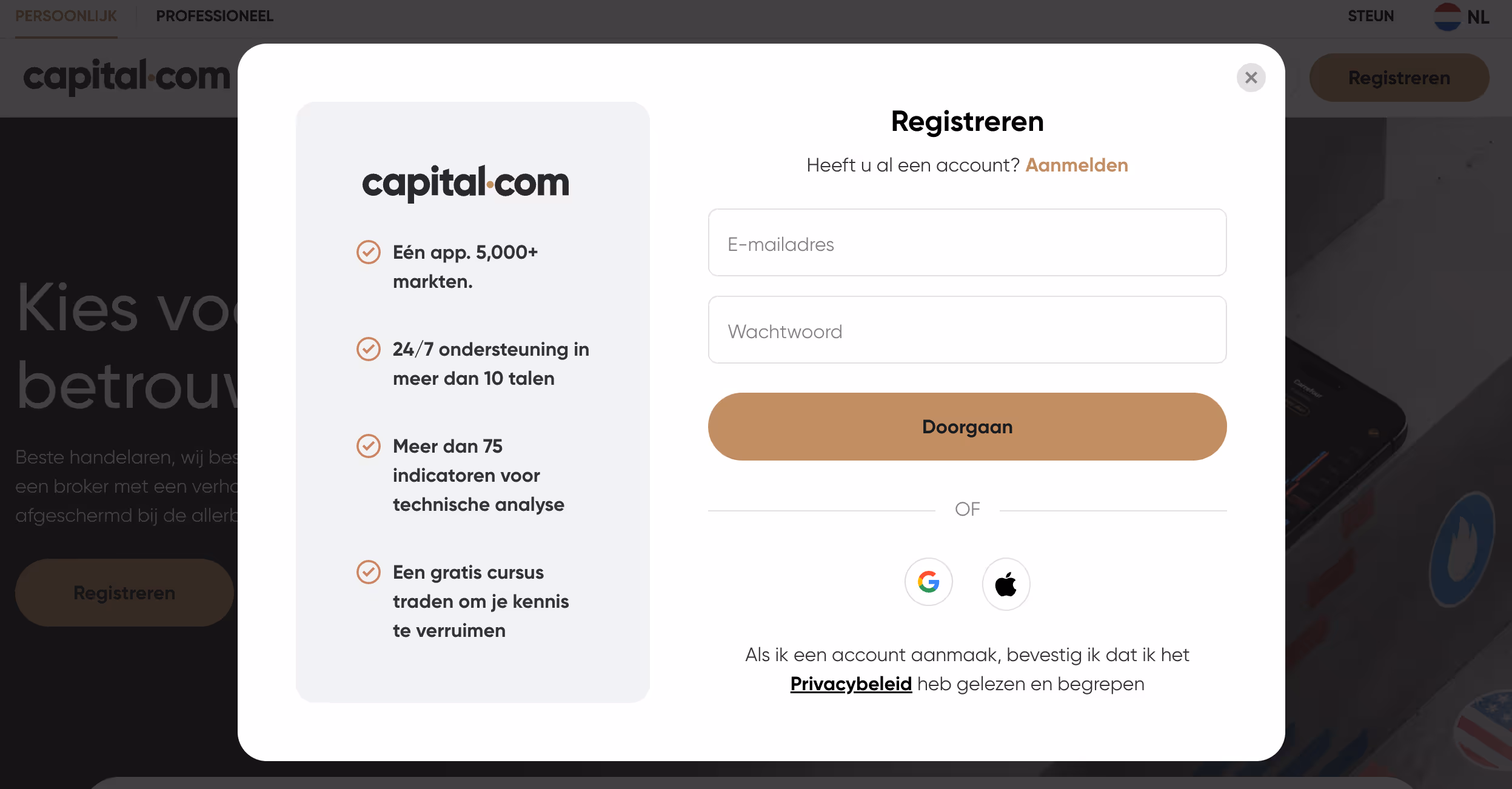 Capital.com is gelanceerd in 2016 en is een van de bekendste CFD-brokers van Europa met meer dan 770.000 beleggers wereldwijd. Het platform biedt toegang tot meer dan 5.000 markten, waaronder aandelen, ETF’s, indices, forex-paren, grondstoffen en cryptocurrencies; allemaal uitsluitend beschikbaar als CFD’s.