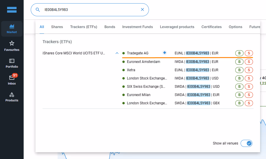 Jeśli weźmiemy iShares MSCI World UCITS ETF Acc (IE00B4L5Y983) jako przykład, widzimy, że można nim handlować na następujących giełdach:
