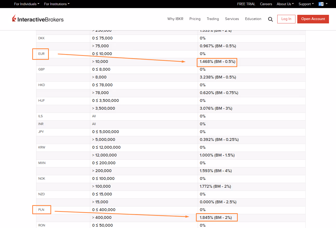 Należy również wziąć pod uwagę opłaty za przewalutowanie, zwłaszcza przy zakupie aktywów w innej walucie (np. amerykańskich akcji). Interactive Brokers oferuje jedne z najniższych stawek przewalutowania na rynku, około 0,002%.