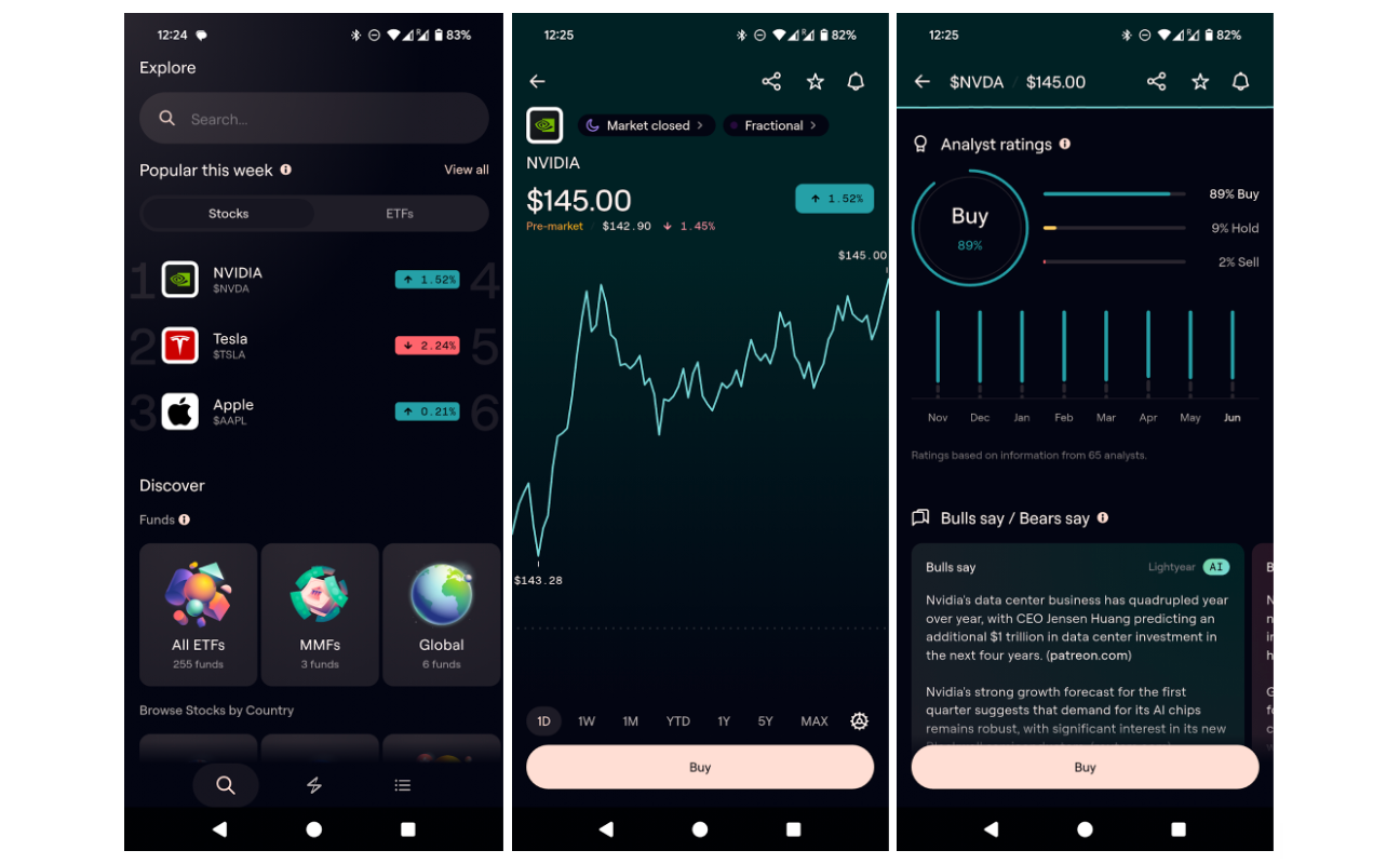 To jedna z najwygodniejszych w obsłudze aplikacji do handlu na rynku. W aplikacji znajdziesz też mnóstwo bezpłatnych analiz akcji — dostęp do danych finansowych i opinii profesjonalnych analityków bez dodatkowych kosztów. Lightyear zwrócił również na siebie uwagę, oferując jedne z najwyższych oprocentowań środków pieniężnych na rynku (niezależnie czy to PLN, EUR, USD czy GBP).