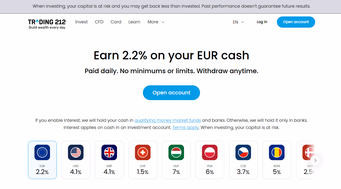 Trading 212 należy do bardziej hojnych platform pod względem odsetek od niewykorzystanych środków: obecnie 2,20% dla EUR (na dzień publikacji tego artykułu). Odsetki są wypłacane dla wielu walut, w tym zł; sprawdź aktualne stawki w aplikacji na stronie „interest”.