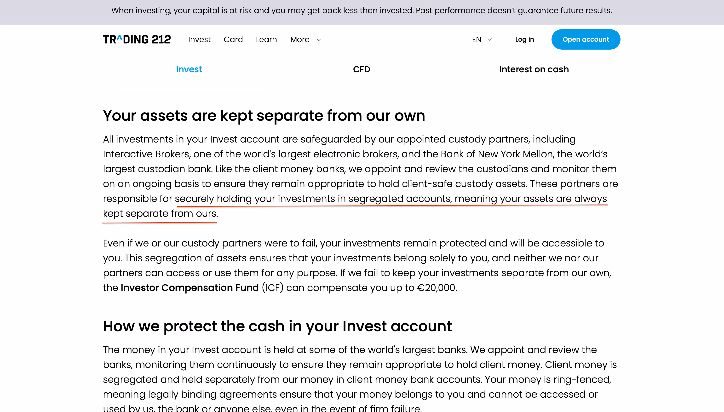 Oprócz nadzoru FCA, ASIC, BaFin i CySEC, Trading 212 jest również członkiem następujących funduszy kompensacyjnych dla inwestorów (ICF). Dla polskich rezydentów obowiązuje: „Polish residents open with Trading 212 Markets Ltd (Cyprus). Covered by the Cyprus ICF (up to €20,000).” Dla klientów podmiotów w Wielkiej Brytanii ma zastosowanie FSCS (£85k), jednak polscy klienci korzystają z cypryjskiego podmiotu.